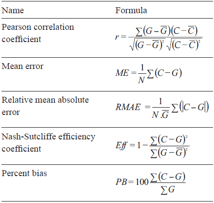 Pearson coefficient measures the linear relationship strength between estimations and observations, varying from –1 to 1 with a perfect positive correlation being 1. ME and RMAE provide information on the error estimation and the average magnitude of error estimations, respectively. ME can take any negative or positive value [mm.month–1] while RMAE acquires only positive values. Both have a perfect score of 0. Eff quantifies rainfall estimations accuracy in relation to the rainfall observations mean, varying from minus infinity to one with a perfect score equal to 1 (McCuen et al., 2006). PB measures the average tendency of estimated values, which can either be larger or smaller than their observed ones, with an optimal value of 0. RMAE and Eff are non-dimensional while PB has units in percentage (Oreskes et al., 1994; Gleckler et al., 2008). For drought monitoring and hydrological purposes, ME and RMAE values close to 0 and Eff values close to 1 are required along with high values of r in order to minimize both overestimation and underestimation of rainfall amounts (Toté et al., 2015).
