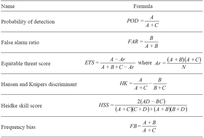Six categorical metrics were used in assessing the monthly CHIRPS v.2 product performance for detection of rainfall events on each rain gauge (listed in Table I). These metrics were derived from a contingency table (not shown here) in which letters A, B, C, and D represent, respectively, hits (events forecast to occur which did occur), false alarms (events forecast to occur, but did not occur), missing (events forecast not to occur, but did occur), and correct negatives (event forecast not to occur, and did not occur) with a rainfall threshold of 5 mm (Toté et al., 2015). These metrics are summarized in Table III.
