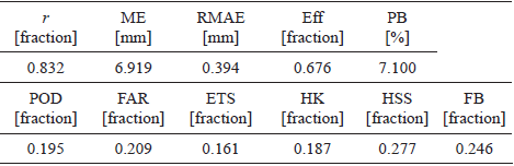 Table IV summarizes performance metrics considering all stations listed in Table I. In general, ME indicates that the CHIRPS v.2 product tends to overestimate rainfall with positive mean errors, which is consistent with the small values of RMAE and PB. On the other hand, the r and Eff metrics are moderately high, suggesting an adequate correspondence between observed and estimated rainfall values. In terms of detection of rainfall events, the CHIRPS v.2 product shows low values of POD, ETS, HK and HSS, and moderately high values of FAR and FB (Table IV), revealing deficient performance. These results warn that the detection of a rainfall event based on the CHIRPS v.2 product is associated to high uncertainty.