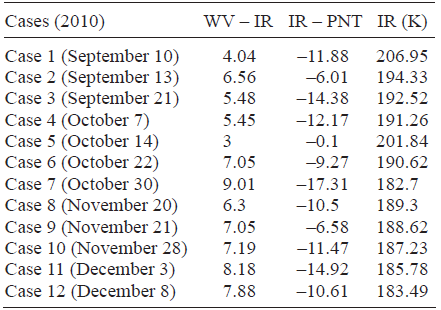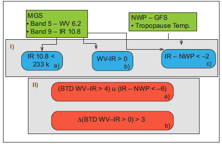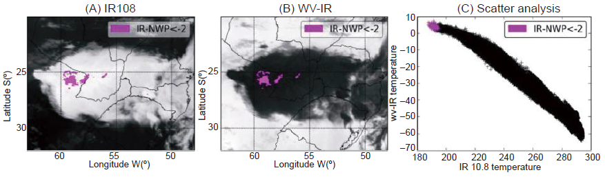 Besides the great utility of this methodology, it must be pointed out that for the South American region, WV – IR BTDs showed inconsistent maxima during periods of low sun elevation angle (e.g., 18:00- 23:00 UTC), which seemed to only affect high clouds.