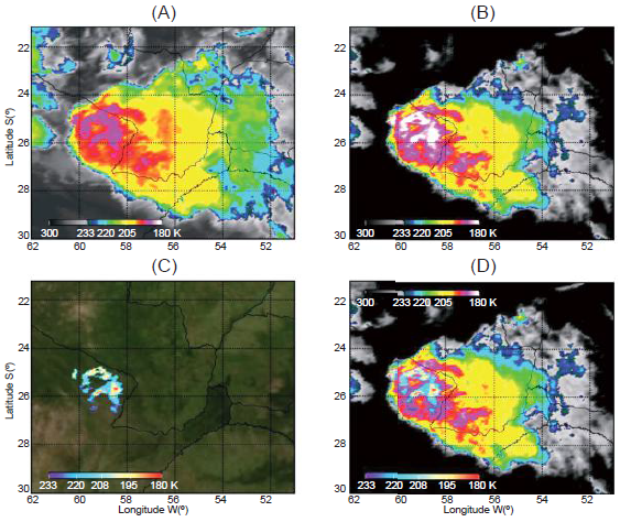 Abstract: Moisture and instability, along with a triggering mechanism, are the main keys of deep convective storms initiation and evolution. Satellite data can provide indirect measurements of instability and moisture of a wide area in short periods of time. This paper studies the use of an objective method based on a blended use of multiple satellite-based convection estimation techniques. This method is based on different techniques arranged in a several layers approach of different convective features, aiming to stratify a cloud shield. Meteosat Second Generation (MSG) infrared (IR) 10.8 μm and water vapor (WV) 6.2 μm channels are explored together with tropopause temperature information provided by a numerical model. Threshold, brightness temperature differences (BTD), and time trends are applied to the information available resulting in a five layers product, highlighting areas of different convective activities. This cloud shield stratification method showed a great ability to better evaluate strong convection when compared with simpler techniques such as IR false color, and was especially useful to better identify the strongest convective cell in a large area with several convective outbreaks. A validation analysis was conducted using radar and lightning data, showing that this approach is very helpful in distinguishing very strong cases from weaker ones by pointing out subtle convective patterns only present in severe storms. Also, small changes in storm evolution were more pronounced in the method output. Besides some uncertainties that were observed, likely due to the large viewing angle, techniques derived from MSG spectral bands displayed good accuracy in studying large convective systems in the South America southern region.