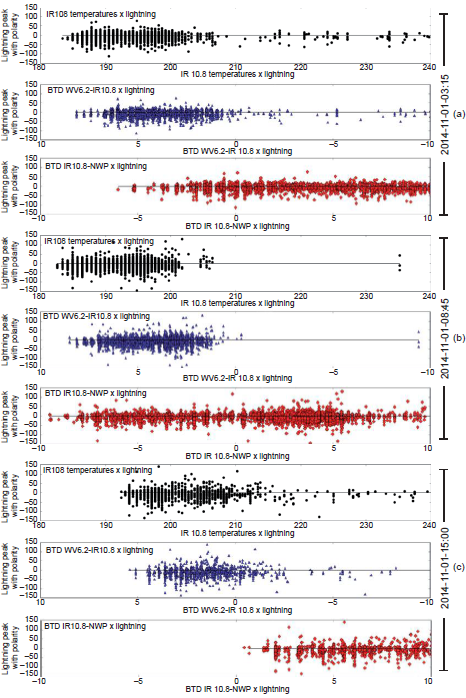 A good relationship with lightning data was also observed. Figure 9 depicts a comparison with all lightning strikes and the three primary parameters of the described approach for three different life stages of an MCS case: mature (a), most intense (b), and dissipation (c).