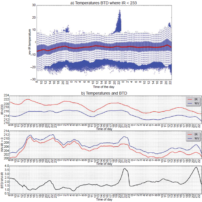 It is known that different viewing angles can affect the way satellite channels observe the atmosphere (Al-Wassai and Kalyankar, 2013), and as a result a full analysis for the region of interest was conducted. WV 6.2 μm – IR 10.8 μm derived from SEVERI channels, in the region of interest of this paper, showed a peculiar behavior at sunset, during which this difference showed inconsistent maximum values. Figure 10a is a representation of WV – IR distribution during an MCS event. During this period (18:00 and 23:00 UTC), positive values of WV – IR BTD showed a notable increase. Maximum values tended to be much greater than in other time frames, while negative values did not show great difference. The separate analysis of IR and WV temperatures revealed that WV channel has the major influence in this pattern. Figure 10b represents a comparison between values of IR and WV in pixels where IR is less than 233 K and where WV – IR positive pixels occurred during the evolution of a storm. In the lapse where BTD had maximum values, the storms did not show great increases in convective activity. This indicates that high BTD values occurred during this interval likely due to some bias in the satellite temperature retrieval. It is possible that this behavior may be present because of a satellite high viewing angle combined with a low solar elevation angle. More research must be conducted to better understand why this happens and the influence of the sun elevation angle during this period for each channel in high clouds.
