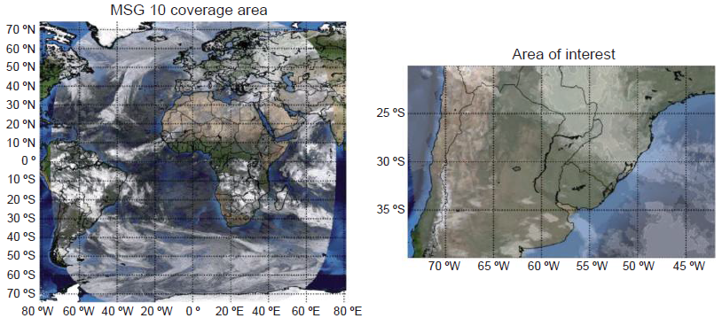 The MSG-10 is equipped with a high-resolution imaging radiometer in the visible and infrared channels (the SEVIRI), consisting of 11 channels with a spatial resolution of 3 km and one channel of 1 km spatial resolution, and a temporal resolution of 15 min. The MSG-10 coverage area can be seen in Figure 1. Each SEVIRI band highlights a particular microphysical characteristic of the deep moist convection. The SEVIRI visible bands (0.6 and 0.8 μm) are capable of estimating optical thickness, amount of cloud water and ice, while the near infrared band (1.6 μm) observes the cloud-top temperature, particle size, shape, and phase. SEVERI WV channels (6.2 and 7.3 μm) can estimate cloud-top temperature and contents of water vapor in two distinct layers of the atmosphere. IR channels (3.9, 8.7, 9.7, 10.8 and 12 μm) can give a good estimation of cloud-top temperature during day and night, essential for cloud system- recognition. SEVERI is also equipped with a high-resolution (1 km) visible channel (HRV) that provides cloud and land surface imagery in great detail. The thermodynamic environment favorable for intense convection is usually created via synoptic- scale and sub-synoptic-scale processes, which may be diagnosed using WV imagery. This channel can also provide information about the amount of water in the upper levels of the troposphere, and sometimes is better than IR or visible (VIS) imagery to detect deep moist convection. The IR channel can measure cloud-top temperature and obtain information to estimate cloud-top height.