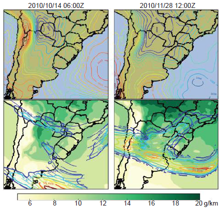 A total of 24 MCSs cases were analyzed. All cases presented life cycles with significant differences in the total period of activity. On average, the total time of duration was 24 h. It is important to note that, in this study, the life cycle was considered as the time between the first storms appearance until total dissipation. According to size and shape, once storms reached the minimum criterion of intensity, they were divided into two subcategories: mesoscale convective complexes (MCC), with a nearly circular shape appearance on satellite imagery, and persistent elongated convective systems (PECS), that presented a more elongated cloud shield. On average, the primary location of storm development was in northern Argentina, and dissipation occurred in southern Brazil. During the storm initiation stage, major differences were noted in the ambient environment, especially in the mean sea-level pressure field and jet stream location. Figure 3 illustrates a comparison of the state of the atmosphere between 2 cases, October 14, 2010 and November 28, 2010. Both cases initiated in northern Argentina and displayed major differences between a weaker and a stronger case observed in the case selection series. A well-defined low pressure center was present in both stronger and weaker cases, located near the border between Argentina, Paraguay and Bolivia (Fig. 3). In the more severe case, a high pressure center was observed south of South America increasing the pressure gradient, and the induced flow contributed to convergence at low levels near the storm formation point, which was at the border between the two pressure systems. Also, the specific humidity field shows a moist atmosphere near the location of storm formation, with magnitudes around 16 g km–1. Other well observed differences included the position and establishment of a subtropical high level jet (SHLJ). In stronger cases, a strong and well established high level jet stream was present while weaker cases displayed a weaker jet stream.
