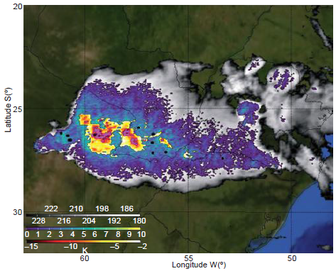 The present diagnostic tool was tested in events of MCSs. These storms are one of the largest and most intense systems occurring in South America. According to Velasco and Fritsch (1987), Laing and Fritsch (1997), Machado (1997), Tsakraklides and Evans (2002), Brooks et al. (2003), Salio and Nicoline (2006), Zipster et al. (2006), and others, the region between 20 and 40º S (Fig. 1) is a preferred site of formation of these MCSs. This region was then chosen as the area of interest, during the first four months of the warm season, from September to December, between 2010 and 2014. The cases selected were according to the SCM definition, large areal coverage and the presence of cloud-top temperatures colder than 205 K in at least one life stage. Selected MCSs were analyzed in their stages of greatest variation: initiation, maximum intensity, and dissipation. The initiation stage spans from the period when the first storms develop to the period in which the phenomenon could be primarily classified as an MCS. The stage of maximum intensity is set around the period in which the storm has the largest area of pixels colder than 205 K estimated by the IR 10.8 μm channel. The stage of dissipation is defined as the period in which the storm intensity decreases until it can no longer be classified as an MCS.