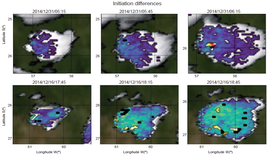 The configuration images of different parameters help to identify the stages visually, not requiring further analysis such as pixel count of certain temperature thresholds. During the stage of maximum convection activity, the size and value of each parameter proved to be good indicators of differences in intensity from one case to another. The combined analyses of WV – IR and IR – NWP showed notable differences in size between extreme and less severe cases. Figure 6 shows the difference in the visualization of a maximum intensity stage occurring in December 17, 2014, by the stratification approach algorithm and the IR false color technique.