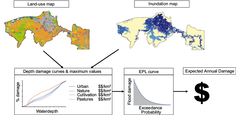 Damage assessment can be improved with local information on potential damage for a larger variety of land use classes. Moreover, depth-damage curves, which are calibrated using Mexican data of experienced flood losses in relation to observed flood hazard conditions, could further improve the analysis. This requires the systematic collection of data about local damages, hazards, and exposure conditions, which can be performed using surveys following flood events. Our more aggregated approach presented here can be adapted for such local analyses, because the basic setup of the modelling approaches presented can be applied on a local scale, as is shown, for example, for a city-scale study in Aerts et al. (2014).
