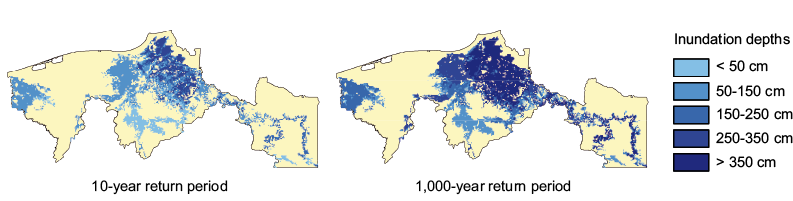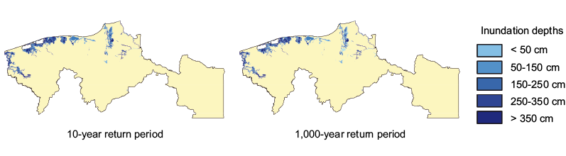 As river and coastal flooding are caused by different processes, to model them requires different approaches. Inundation maps for river flooding are created with the GLObal Flood Risk with IMAGE Scenarios (GLOFRIS) modelling cascade (Ward et al., 2013; Winsemius et al., 2013). The inundation routine is described in detail in Winsemius et al. (2013) and the framework for simulating inundation for different return periods is described in Ward et al. (2013). The GLOFRIS model cascade has been applied in several flood risk analysis studies at different scales (Hallegatte et al., 2016; Muis et al., 2015; Sadoff et al., 2015; Ward et al., 2014), and provides inundation maps for different return periods at a resolution of 30 arc seconds (~ 1 km at the equator). In this study, eight different return periods are included: 5, 10, 25, 50, 100, 250, 500, and 1000 years. The GLOFRIS model is used here to simulate current inundation maps for the rivers in Tabasco, as well as future inundation maps under different climate change scenarios. The simulations used in this study are taken from the GLOFRIS model runs and setup described in Winsemius et al. (2016). To simulate historical conditions, the hydrological component of GLOFRIS was forced with climatological forcing data (precipitation and temperature) from the EU-WATCH project (Weedon et al., 2011) for the period 1960-1999. These data are derived from the ERA-40 re-analysis product (Uppala et al., 2005). For future climate, the model is forced with bias-corrected forcing data from the HadGEM2-ES Global Circulation Model (GCM), taken from Hempel et al. (2013). For this study, we used simulations for two Representative Concentration Pathways (RCPs), namely RCP2.6 and RCP8.5. These pathways describe a lower and upper scenario for global warming (IPCC, 2014). We use the data for 2060-2099 to represent the year 2080. It should be noted that although we provide the flood inundation maps for the state of Tabasco only, these maps account for water that may have entered the rivers from neighbouring Mexican states, and thus the entire upstream catchment area is also simulated. Figure 3 shows two examples of inundation maps for different return periods of river flooding. Note that these maps do not show the extent of one flood, but rather that the chance of flooding in these areas is one in 10 (left) and one in 1000 (right), respectively.