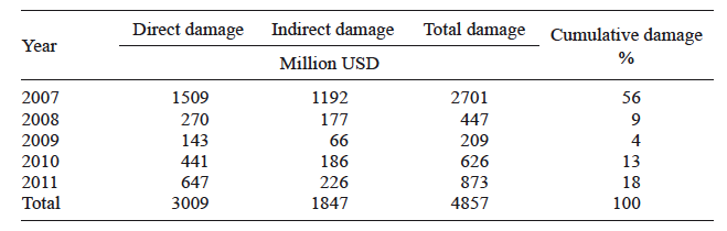 Table I summarises the damages for the years 2007-2011 reported by the United Nations CEPAL (2011). The damages are shown separately for direct damage, i.e. the destruction of physical capital, and indirect damage, i.e. production losses due to the interruption of economic activities, both inside and outside the affected area (Koks et al., 2015).