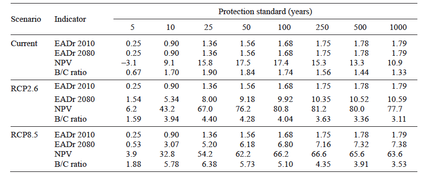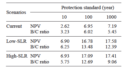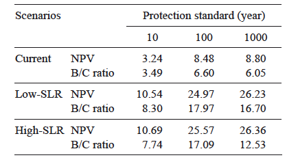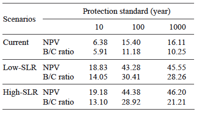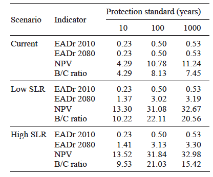 Similarly to river floods, a 1000-yr protection standard for the low-SLR scenario implies a lower dike structure compared to the same protection standard for the high-SLR scenario. Considering the approximately similar NPV and B/C values for both scenarios, the safe policy strategy could be to follow the high-SLR scenario in the design of flood protection infrastructure.