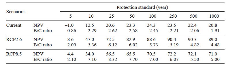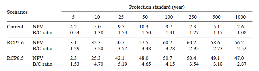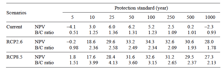 Furthermore, different assumptions about the discount rate used for translating future monetary costs and benefits to current values in the CBA indicators may influence these conclusions. We assumed that the rate of pure time preference ρ is 1%, leading to a baseline value for the social discount rate r of 4%. However, a higher bound rate of pure time preference of 3% has been assumed in other studies (e.g., see Tol, 2008). Therefore, the social discount rate was set to 6% to test the sensitivity of our results to this higher value. As a result, all NPV and B/C ratios become lower (Tables SV-SVI in the supplementary material). With a social discount rate of 6%, we find that a 50-yr protection standard is optimal under the assumption of current climate conditions. Under future climate conditions, the economic optimum remains a 250-yr protection standard. The 5-yr protection standard now has a negative NPV under the RCP2.6 scenario, and is therefore economically undesirable. The conclusions for coastal protection remain the same, although with lower NPV and B/C ratios.