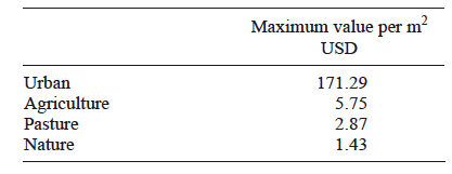 A detailed land use dataset for Tabasco was obtained through the Centro de Ciencias de la Atmósfera (Center for Atmospheric Sciences) of the Universidad Nacional Autónoma de México (UNAM). While the land use dataset describes 63 different land use classes, no detailed information was available on maximum damage per class, which is a required input for the flood damage estimations. Therefore, we aggregated the comprehensive dataset in four overarching categories with similar damage characteristics: Urban, Cultivation, Pastures, and Nature. To provide an estimate of damage, maximum damage values were obtained from the DamageScanner model (de Moel and Aerts, 2011; de Moel et al., 2014), converted into USD (2013), and corrected for the Mexican GDP (2013). These maximum damage values for Mexican land use categories are presented in Table II. For consistency with the flood hazard maps, we resampled the dataset to 30 arc seconds for calculating the EAD for river floods, and to 25×25 metres for calculating the EAD for coastal floods.
