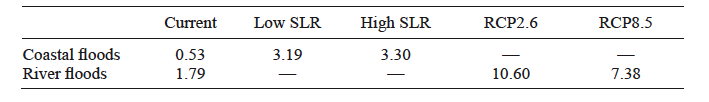 Table IV shows that the EAD of river floods for Tabasco is approximately four times higher than the EAD for coastal floods, under the assumption of current climate conditions. In the low-SLR scenario, the EAD of coastal floods will rise to be six times higher in 2080 than under the assumption of a static sea level. The high-SLR scenario shows an only slightly higher EAD.