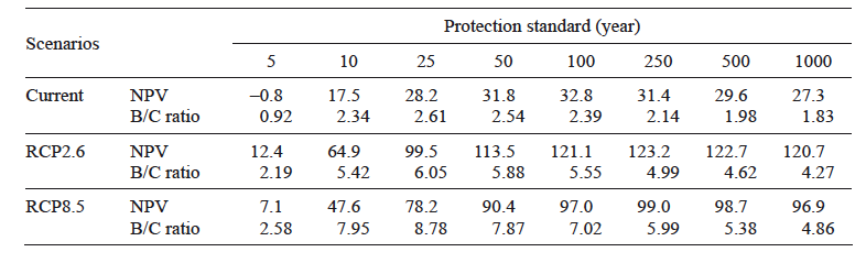 For the social discount rate r, we assumed that the rate of pure time preference ρ is 1%, following Tol (2008), leading to a social discount rate of 4% based on the Ramsey’s formula. However, Tol (2008) also indicates that some studies use a rate of pure time preference of 3%. Therefore, we changed the social discount rate to 6% here. The results are shown in Table SV for river floods and Table SVI for coastal floods. All NPV and B/C ratios are lower. If it is assumed that the climate does not change, optimal river protection standards remain at 50 year at an r of 6%. Furthermore, the 5-yr protection standard under the RCP2.6 scenario is no longer economically desirable. Both RCP2.6 and RCP8.5 scenarios now result in a highest NPV for a protection standard of 100 years. All conclusions for the coastal protection standards remain the same, but with lower NPV and B/C ratios, as shown in Table SVI.