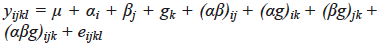 where μ = average; αi = site; βj = season; gk = day/night shift; i = effect of i level site; j = effect of j level season; k = effect of k level day/night shift; (αβ)ij = effect of the interaction between i level site and j level season; (αg)ik = effect of the interaction between i level site and k level day/night shift; (βg)jk = effect of the interaction between j level season and k level day/night shift; (αβg)ijk = effect of the interaction between i level site, j level season, and k level day/night shift; and eijkl= standard error.