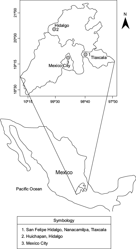 The present study surveyed three different sites (Fig. 1). The first of these sites was the ecotourism park Piedra Canteada, located in the town of San Felipe Hidalgo, municipality of Nanacamilpa, Tlaxcala, with geographical coordinates 19º 28’-19º 26’ N, 98º 36’-98º 35’ W. This area has an altitude ranging between 2700 and 3100 masl. It has a temperate, sub-humid climate with rainfall in summer and an annual precipitation average of 700-1000 mm. The annual average temperature ranges between 18 and 24 ºC, with variations ranging from 0.5 ºC to 24.6 ºC (INAFED, 2016a).