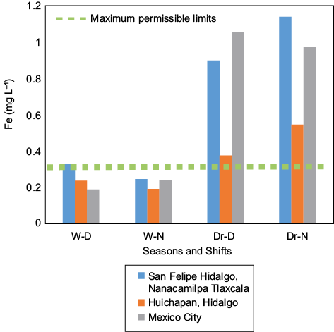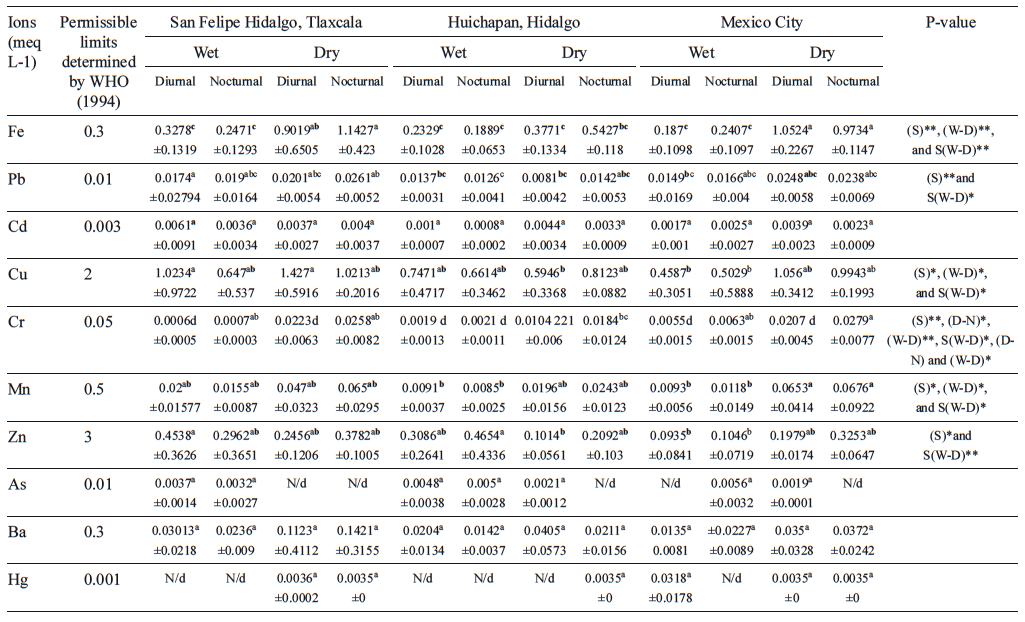 According to the information in Table I, the elements exceeding the maximum permissible limits by the WHO (1994) are, in descending order, Fe, Pb, and Cd, concurring with Mat et al. (2014). The concentrations of Cu, Cr, Mn, and Zn are below the maximum permissible limits, although significant differences were present among sites, season and shifts. Ions of Ba and As were also at concentrations less than the permissible limits established by the WHO (1994), not exhibiting significant differences among the studied factors. As ions were absent in several samples collected during the dry season in the three study sites, particularly when atmospheric water vapor condensation occurred during the nocturnal shift. Similarly, Hg ions were absent in samples collected during the wet season; regardless, this element exceeded the maximum permissible limits determined by the WHO (1994) in those samples where it was detected, especially during the dry season. The concentration of the analyzed ions agrees with reports by Gandhidasan and Abualhamayel (2007) for Arabia, Bautista et al. (2014) for Mexico, Patel et al. (1998) for India, Joos and Baltensperger (1991) for Switzerland, and Jacob et al. (1985, 1986) for the USA.