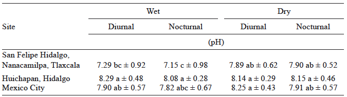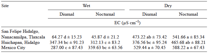 During the wet season, the highest average EC values were observed in Mexico City (360 µS cm–1) and the lowest in San Felipe Hidalgo, Tlaxcala (50 µS cm–1). During the dry season, the highest average EC values were also observed in Mexico City (580 µS cm–1) and the lowest in Huichapan, Hidalgo (460 µS cm–1).