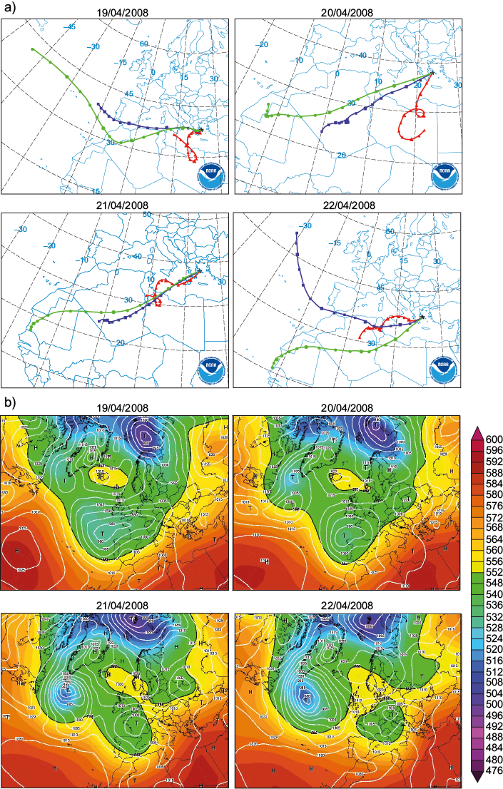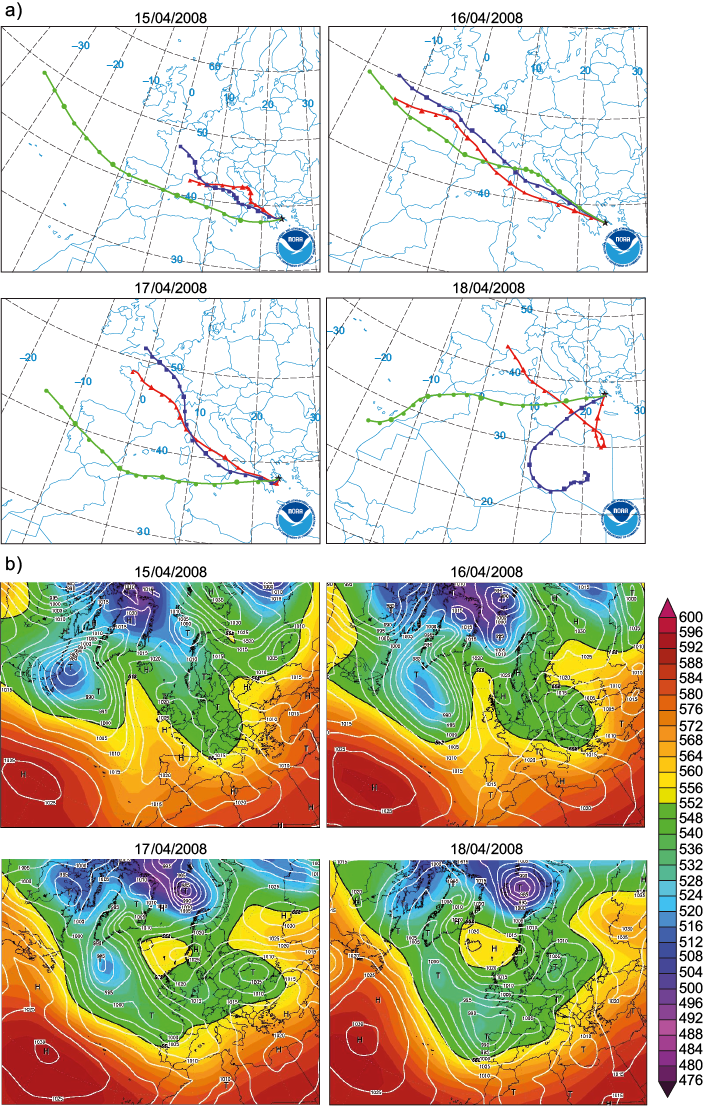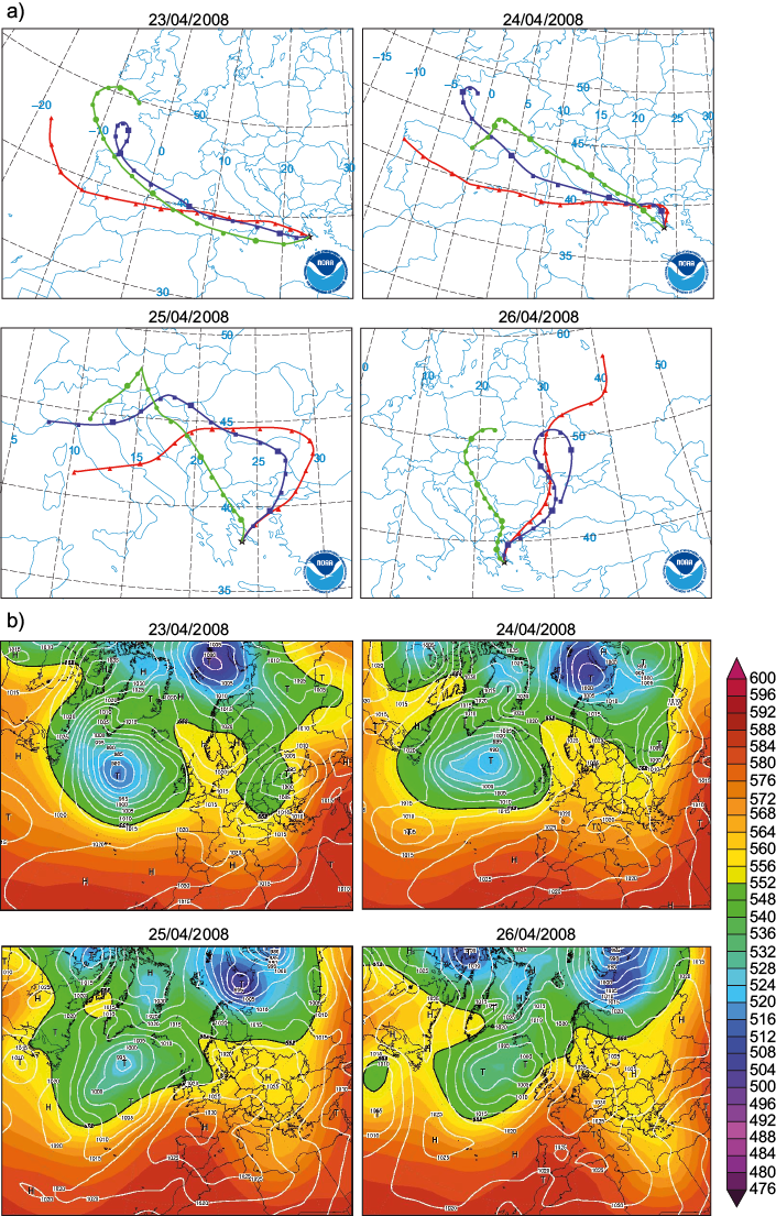 In order to achieve dust aerosol event, a day-by-day observation of a severe two wave (the first from 10/04/2008 to 14/04/2008 and the second from 19/04/2008 to 22/04/2008) which struck Athens during April 2008, daily AOD values from MODIS were plotted. The R software was used for visualization purposes. The area of interest for this work extends within 27.0-47.0 N and 10.0-47.0 E. Aiming to fully analyze the evolution of this vigorous dust episode, the four-day time intervals which elapsed among the two dust waves, and also before the first and after the second dust wave, were also studied. Thus, a 21-day period (06/04/2008-26/04/2008) was finally taken under consideration. The Hybrid Single-Particle Lagrangian Integrated Trajectory (HYSPLIT) model (http://www.arl.noaa.gov/HYSPLIT.php) of NOAA, based on NCEP/NCAR global reanalysis meteorological data, was used in order to produce backward air mass trajectories with duration of four days, in order to identify the origin of the air masses carrying the exogenous particles in Athens. Three air mass arrival heights above ground level (AGL) were selected: near ground (500 m AGL), upper boundary layer (1500 m AGL), and free atmosphere (3000 m AGL), whereas the arrival time was set at 12:00 UTC. In addition, maps presenting the geopotential height (tens of meters) of the 500 hPa pressure level along with surface barometric pressure (hPa) were also created by NCEP/NCAR reanalysis data, through the website http://www.wetterzentrale.de/topkarten/fsreaeur.html of the German weather service.