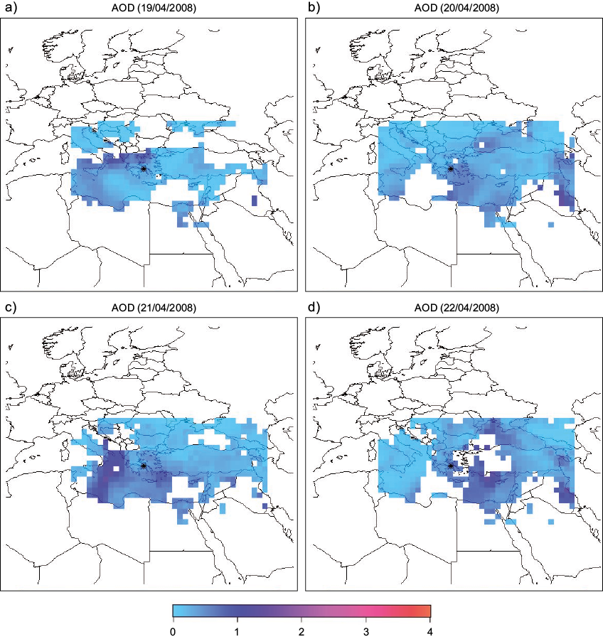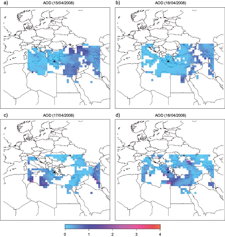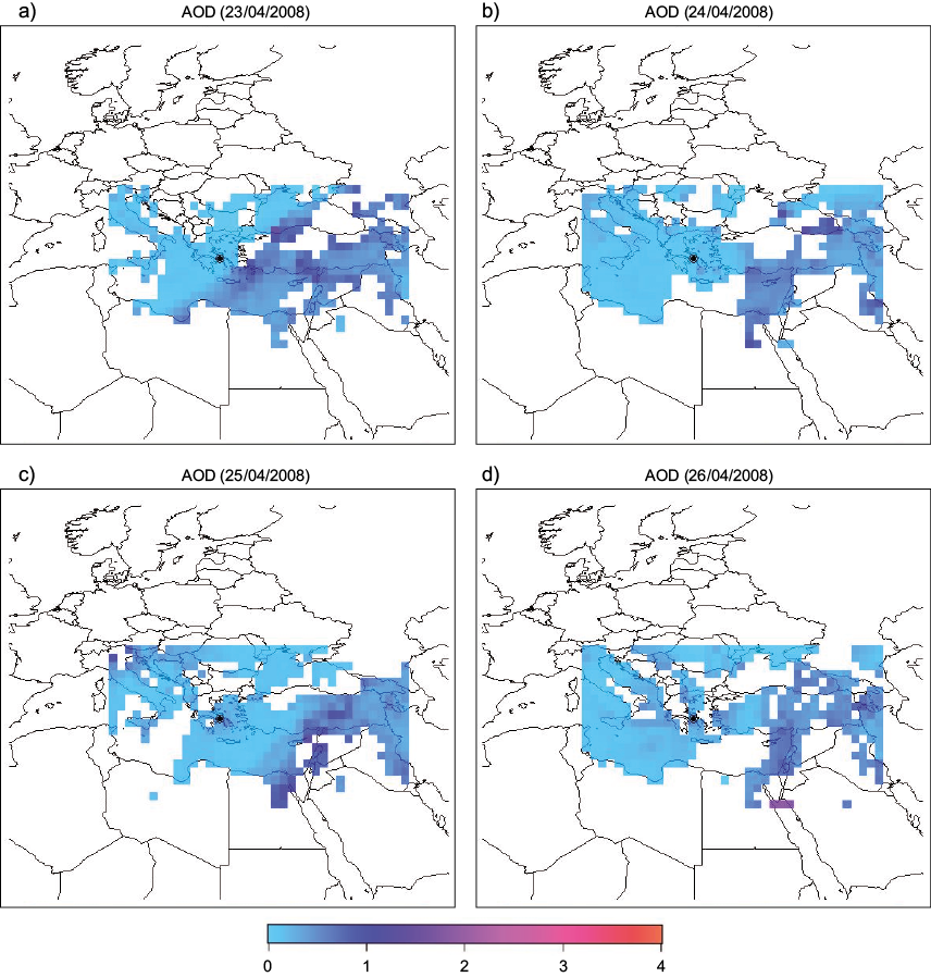 For the detection of possible aerosol intrusions in Athens, Greece from transboundary sources, daily AOD (dimensionless) values at 550 nm were also used. These AOD measurements are included in the product Collection 5.1 (level 3) of the Moderate Resolution Imaging Spectroradiometer (MODIS) system, carried aboard the Terra satellite of the National Aeronautics and Space Administration (NASA). During the studied period (06/04/2008-26/04/2008), Terra satellite overpassed the Eastern Mediterranean around 09:30 and 20:30 UTC. Daily AOD data are derived on a 1º × 1º resolution grid and were downloaded from NASA’s portal Giovanni (http://giovanni.sci.gsfc.nasa.gov).