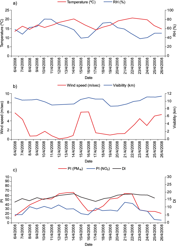 Daily average PM10 concentrations were strongly amplified during the two dust events, thus PI values for PM10 were classified in the upper boundaries of the moderate pollution category (Fig. 13c) according to Table I. After the passing of each dust wave, PI values for PM10 returned to the low pollution category (PI < 50). On the contrary, PI values for NO2 remained in the low pollution category (PI <5 0) or in the good quality category (PI < 25) during the whole studied period (Fig. 13c), thus low combustion emissions were suggested. Finally, despite the increase in temperature levels, DI stayed in the thermal comfort category (< 21) throughout the two dust events (Fig. 13c), thus no thermal stress for the population was indicated (Table II).
