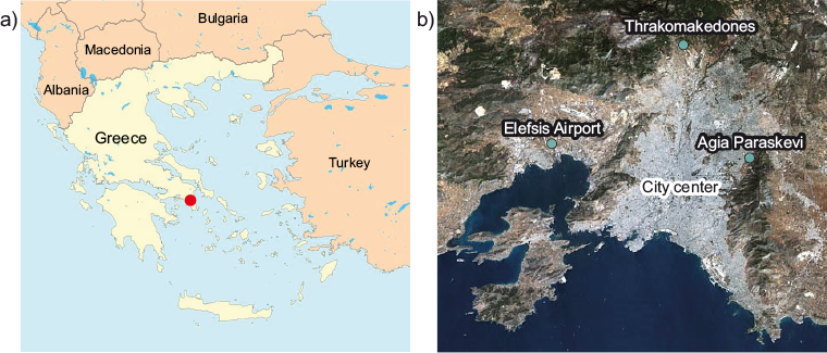 Athens is the capital city of Greece with approximately 5000 000 inhabitants and thus incorporates almost 50% of the country’s total population. The city’s public air quality monitoring network is supervised by the Greek Ministry of Environment and Energy and includes 22 urban and suburban stations with traffic, background and industrial characteristics. For this paper, ground based measurements of PM10, PM2.5 (particulate matter with aerodynamic diameter less than 2.5 μm) and NO2 daily average concentrations were obtained from the suburban background monitoring station of Agia Paraskevi (AGP), located in the northeast (NE) boundaries of the Athens basin (lat. 38.00, long. 23.82, alt. 290 m) (Fig. 1a). The available hourly concentrations of NO2 were also used. Due to the absence of direct combustion emissions (e.g., traffic, industrial, etc.) in the vicinity of AGP station, the selected sampling site was considered as ideal for the identification of atmospheric long-range transport influences, in contrast with central heavily trafficked sites. This study is focused on the AGP station, where PM2.5 measurements are performed, yet PM10 daily concentrations from the suburban background monitoring station in Thrakomakedones (THR) (lat. 38.14, long. 23.76, alt. 550 m) (Fig. 1a) were also used in order to verify our findings and also to provide additional information concerning the spatial distribution of exogenous material over Athens. All data were downloaded from the website (http://www.eea.europa.eu) of the European Environment Agency (station codes: GR0039A [AGP], GR0037A [THR]). PM measurements were performed with Thermo Andersen ESM FH 62 I-R beta ray attenuation scanning devices, whereas NO2 monitoring was carried out with a chemiluminescence analyzer (Horiba model APNA 360).