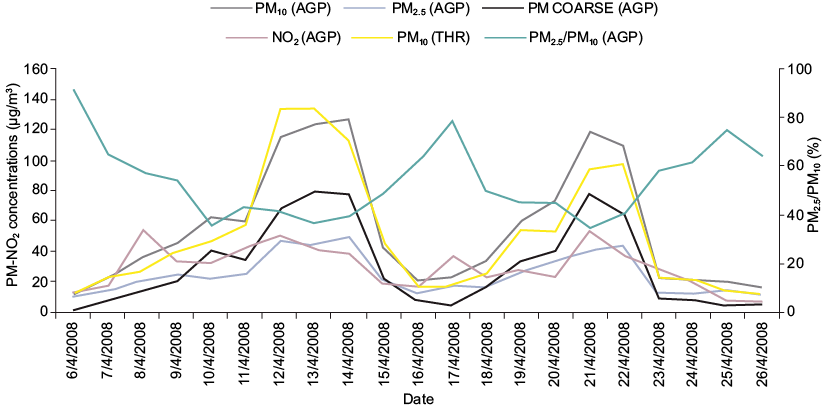 Intense variations of PM concentrations were recorded at AGP during the studied 21-day time interval (Fig. 2). Daily average PM10 levels exceeded the daily limit of 50 μg m–3 from 10/04/2008-14/04/2008 and also from 19/04/2008-22/04/2008, however extreme concentrations of PM10 were particularly indicated during 12 (114 μg m–3), 13 (124 μg m–3), 14 (127 μg m–3), 21 (110 μg m–3), and 22/04/2008 (109 μg m–3). These highly increased concentrations were primarily attributed to the increment of PMCOARSE levels (e.g., dust, pollen), as it was clearly deduced from a drop of PM2.5/PM10 (%) fraction (Fig. 2). In addition, PM2.5 levels were only slightly enhanced during the episodic days. Similar variations of PM10 levels and extreme PM10 concentrations, were also detected in THR during the same period (Fig. 2), hence long range transport impacts were suggested. NO2 was considered as a marker of local combustion emissions and thus, weak variations of NO2 levels, observed during the whole studied period (Fig. 2), strongly disconnected the extreme aerosol loadings from local anthropogenic PM sources.