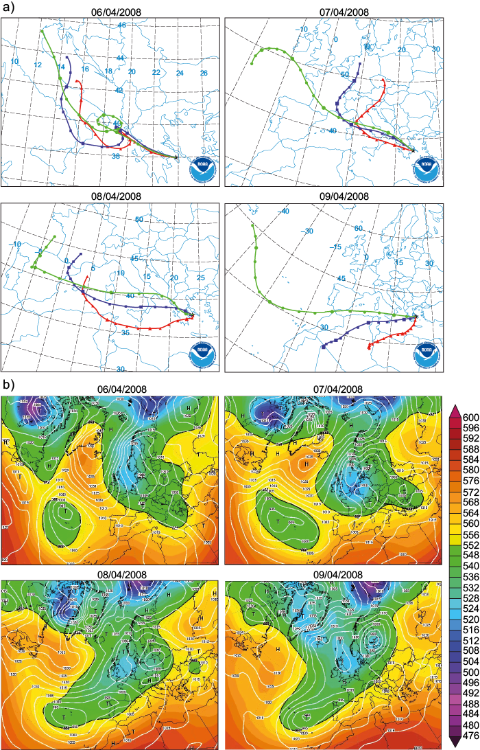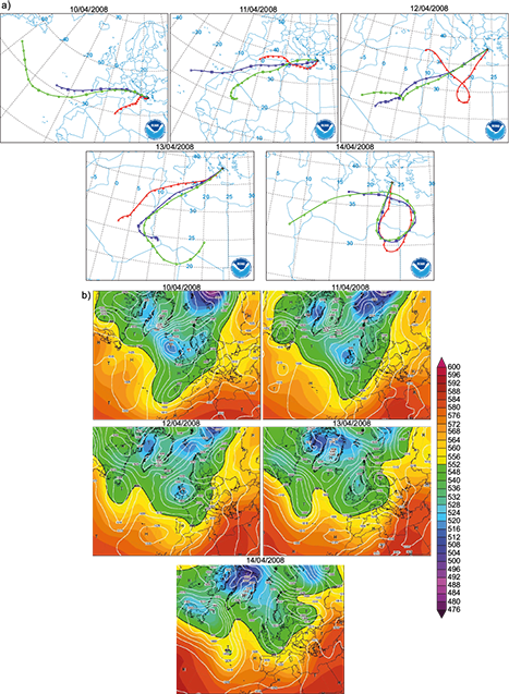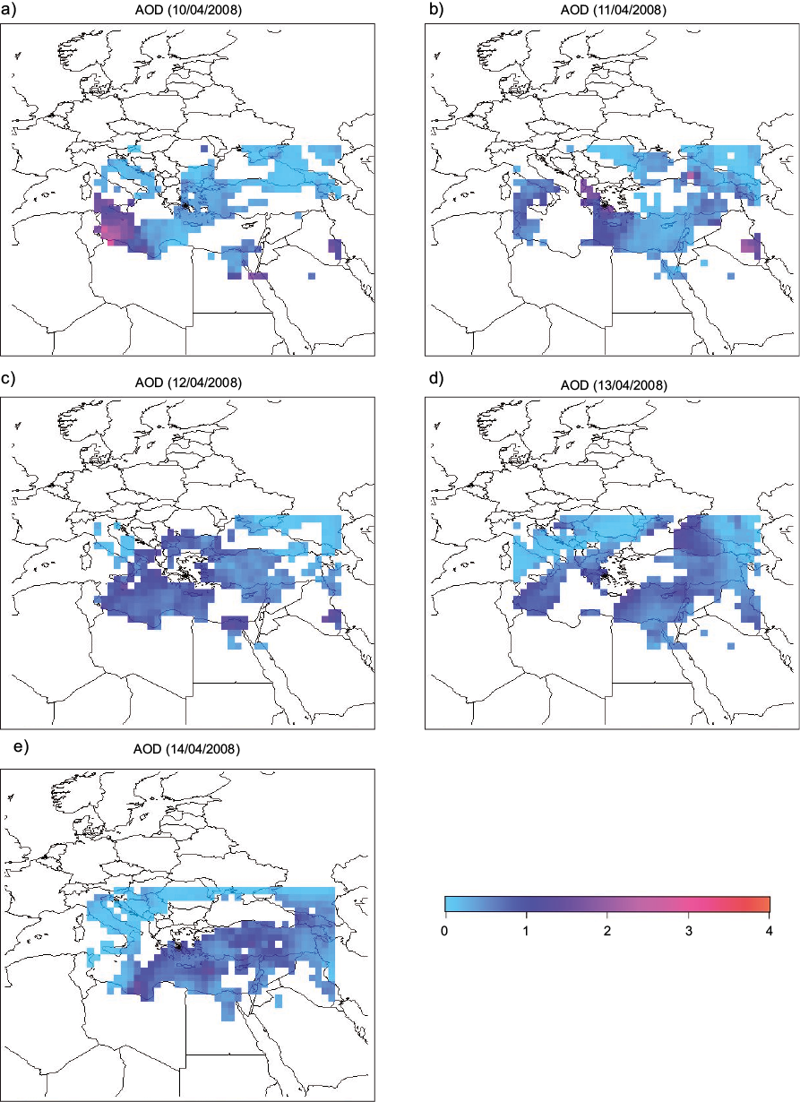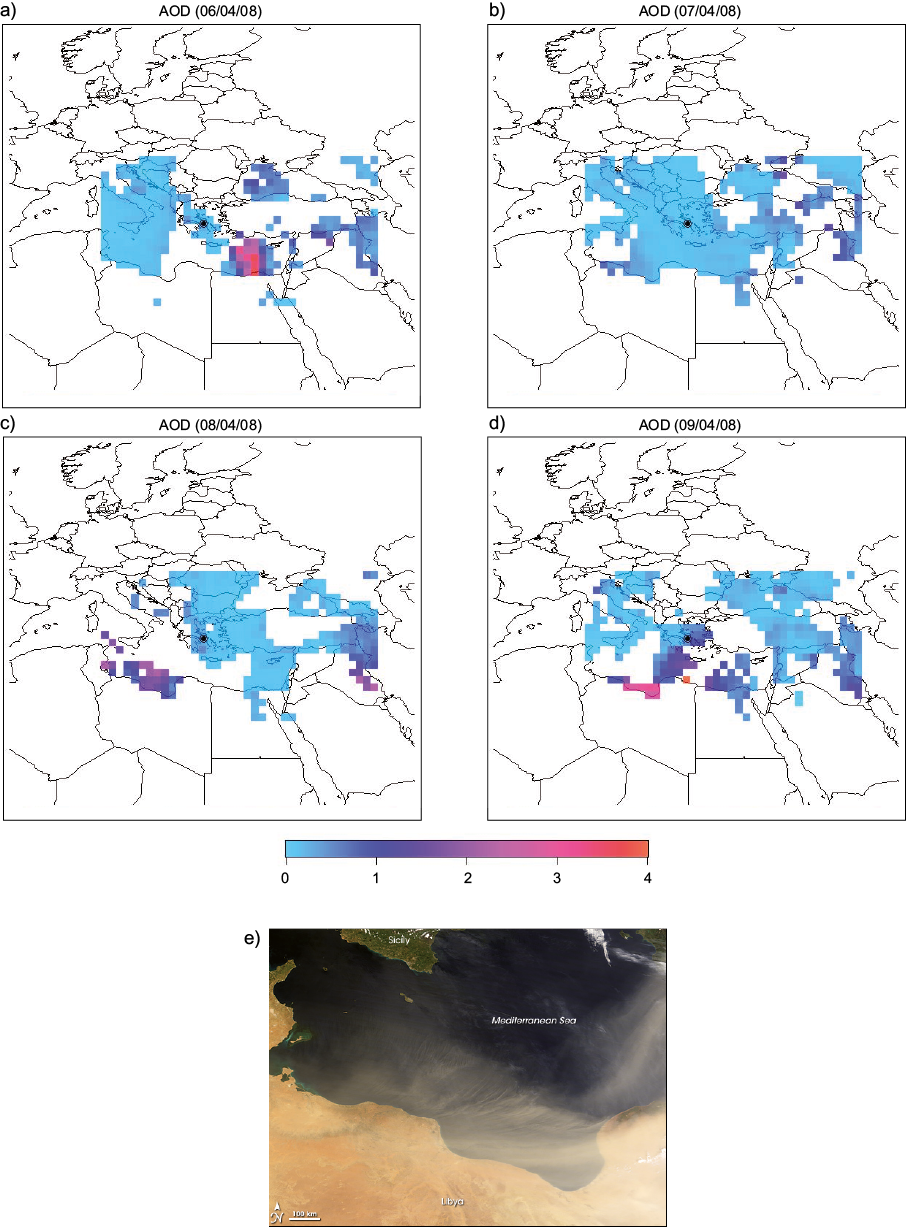 Air mass trajectories ending in Athens at 06/04/2008 and 07/04/08 indicate the city was affected by a north-west (NW) airflow (Fig. 3a) attributed to a deep depression located at the North Sea area (Fig. 3b). However, during 08/4/2008 and primarily 09/04/08, due to the advent of a low pressure system from the mid-Atlantic to West Europe, air parcels possibly enriched with dust aerosols approached Athens from south west (SW) directions (Fig. 3a). This hypothesis was verified by AOD observations of MODIS (Fig. 4) indicating a dust plume from Libya and Tunisia moving towards Greece (Fig. 4c, d, e). The initial effect of incoming dust was recorded at AGP during 09/04/2008, when the average daily PM10 concentration was 46 μg m–3 (Fig. 2).