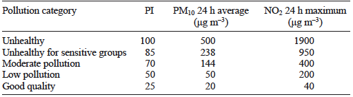 (4)where BPhi and BPlo are the upper and lower concentration breakpoints respectively of the PI category in which Cp corresponds, and PIhi and PIlo are the upper and lower PI breakpoints of the same category respectively (Table I). Daily PI was also applied for NO2, for which Cp is the maximum hourly concentration of the studied day.
