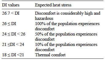 The incoming air masses of North African origin, besides the transfer of particulates, may also provoke radical variations in temperature and RH levels, inducing thermal stress. For that reason, a simple discomfort index (DI) (Thom, 1959) was implemented in order to estimate the environmental heat stress and the correlated thermal sensation, according to the DI classes described in Table II. The DI was calculated according to (5) (Giles et al., 1990; Mavrakis et al., 2012):