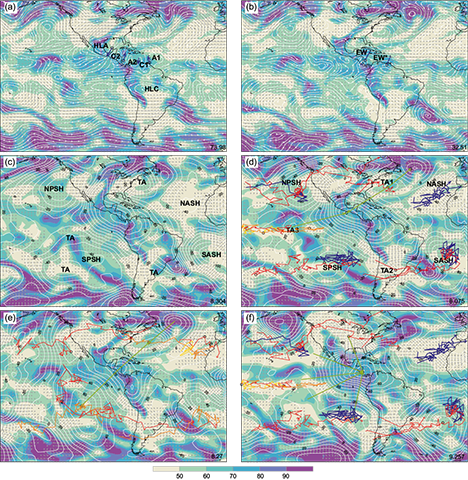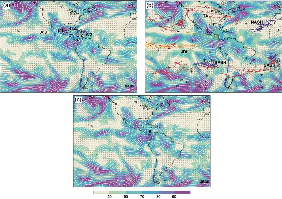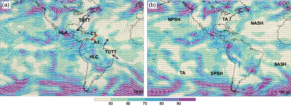 Figure 1a shows the relative humidity in the 700-925 hPa layer and the average streamlines for the upper layer (200-300 hPa) on October 16, 1998 at 12 UTC. The interesting feature in this field that passes over the tropical American region is the dipolar envelope that contains two vortices; one is the high-level anticyclone from South America (HLC), and the other is the high-level anticyclone from North America (HLA) (Reed, 1933). Two trough lines referred to as TUTT and small cyclone (C1) and anticyclone (A1) can also be seen in Figure 1a.