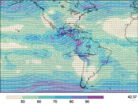 Figure 1b shows the average streamlines for the lower layer (925-1000 hPa) and the relative humidity (for the 700-925 hPa layer, shaded) for October 17, 1998 at 00 UTC. A longitudinal band of eastern zonal wind was located at the south of the Gulf of Mexico, induced by a transient anticyclone labeled as TA and a zonal wind traced to the central Atlantic caused by the southern edge of the North Atlantic Subtropical High (NASH). As the eastern zonal wind continued to the Americas, some streamlines are directed toward Mexico-Central America and other streamlines to South America. As the eastern wind continued to flow into the Caribbean Sea, a tropical wave associated to the origin of Mitch is not present in the streamlines.