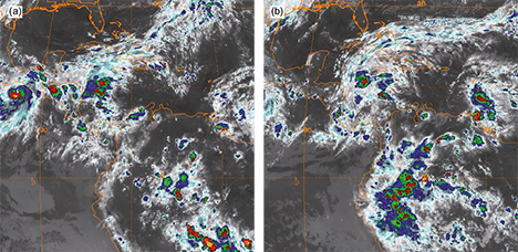 Figure 3c shows the convergent/divergent average wind and its corresponding potential function in the 925-1000 hPa layer and the average relative humidity (gray shades) in the 700-925 hPa layer for October 18, at 00 UTC. A notable feature in this figure is the strong convergence and high relative humidity throughout Central America, Mexico and the northwest of South America, since the Caribbean Sea, the eastern Pacific and the Gulf of Mexico serve as sources of atmospheric humidity for rainfall in the Americas (Hales, 1974; Ting and Wang, 1997; Barlow et al., 1998; Klimczak, 2000; Wang, 2007). Near the northeastern equatorial Pacific, the trade winds southwest of Baja California become wet toward Mexico and Central America (Fig. 3b).