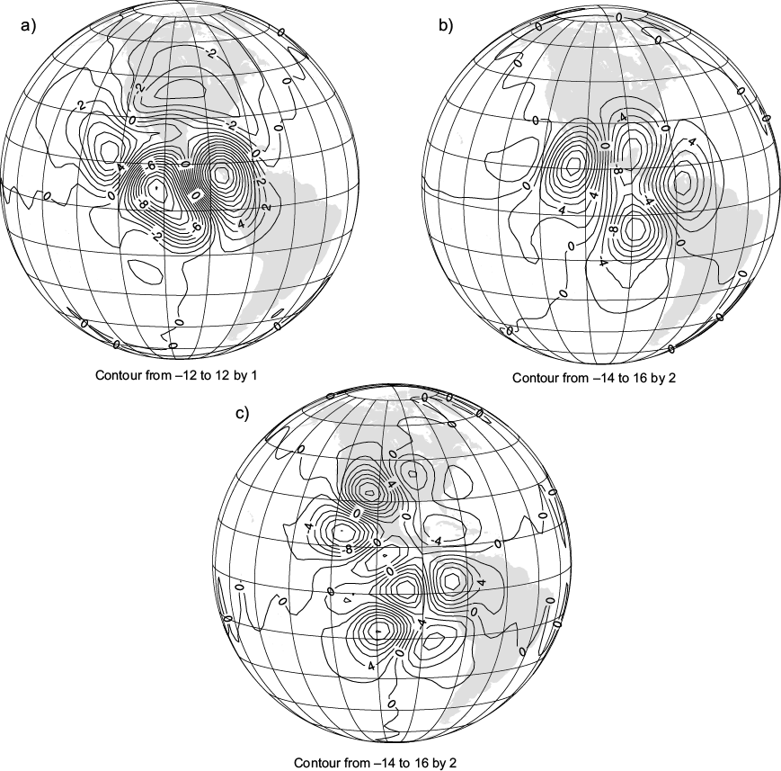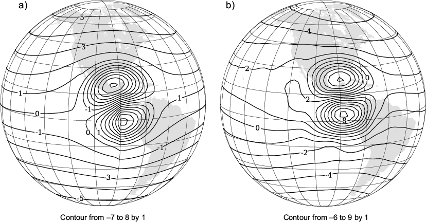 The simplest idealization of the NW-SE dipolar vortex is a modon (Verkley, 1984), which is an exact solution of the BVE on a rotating sphere. According to the observations, a NW-SE dipolar circulation pattern was constructed in such a way that it remained stationary and only needs to be adjusted to the data, which is the subject of future works.