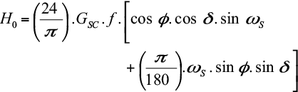 Daily extraterrestrial solar radiation on a horizontal plane (H0) can be found as a function of solar constant (Gsc = 1367 W m–2), solar correction factor of the earth (f), declination angle (δ), latitude of the area (ϕ), and solar hour angle (ωs) (Duffie and Beckman, 1991).