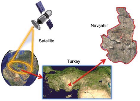 The ground database was obtained from the Turkish State Meteorological Service (TSMS) for selected years in Turkey. This data set consisted of daily measurements of global solar radiation on a horizontal surface with a pyranometer; the duration of daily bright sunshine was either collected with a modern sunshine duration sensor, which makes use of photo-diodes (special design electronic systems), or with the classic Campbell-Stokes type sunshine recorder, which is widely used because it is simply operated. Many stations all over the world use this type of sunshine duration recorder, therefore longterm reliable sunshine duration data for at least 100 years are thought to be found all over the world (Myers, 2003; Muneer, 2004; Massen, 2011). The quality of all surface data sets was verified by the TSMS. Solar radiation data were available in instantaneous ground records for the selected location, and could be converted to hourly, daily or monthly global solar radiation values. The measuring instruments were mainly black and white-type thermopile pyranometers and new pyrheliometers. The data analyzed cover a 6-yr period. It is adjusted to a useable form with the unit MJ m–2 day–1. The selected station (Nevşehir, Turkey) is located at 38.37º N, 34.42º E, 1259.54 masl. The geographical location of the selected station and a schematic representation of satellite observations are given in Figure 1. The climate regime of Nevşehir was defined as cold steppe climate or cold semi-arid (BSk) according to the Köppen-Geiger climate classification (Threwartha and Lyle, 1968). In addition, satellite images from the last 6 yrs were taken from the METEOSAT-8 satellite. With these data, hourly global solar radiation and cloud index values for the selected station were calculated by using the HELIOSAT method. From these data, the daily summation of global solar radiation was derived. The HELIOSAT-1 calculation procedure and satellite visible channel images were obtained from the University of Oldenburg.