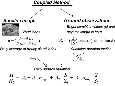 (8)where navg is the average values of the daily cloud index; s/S0 is the sunshine duration fraction, and A0, A1, A2 and A3 are defined as four dimensionless regression coefficients. The flow diagram in Figure 2 schematically illustrates the fundamental coupled method principle.