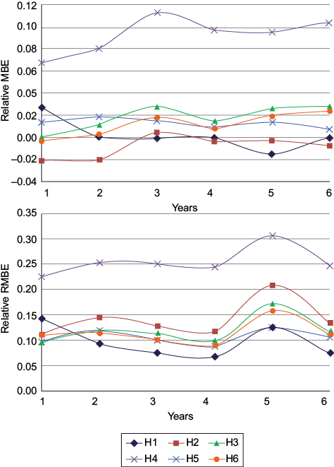 The performance of solar radiation estimation with the different methods analyzed was compared with the RRMSE and RMBE statistical error measures. In the applied methods, the daily global solar radiation and the daily bright sunshine data arrays from Nevşehir station were used. In addition, a 6-yr time period was chosen for this study, and daily values were simply obtained by collecting hourly values. Figure 3 shows representative results for relative values of the yearly mean bias error RMBE and yearly RRMSE for the selected location. As seen from Figure 3, in the HELIOSAT method (H4) the relative difference between measured and estimated values is higher at Nevşehir station during the whole year. Also, RRMSE error values are generally higher for this satellite method. However, the results of the RMBE and RMSE are the smallest values for the Angstrom method (H1) during the whole period of the study. Nevertheless, the coupled method (H5) and the average coupled method (H6) are better than the other methods (H2, H3, H4), as expected. The best performing method after the Angstrom method (H1) is the coupled approach (H5) method. Figure 3shows that the coupled and average coupled approaches (H5 and H6, respectively) yield quite satisfactory results when compared to the classical Angstrom method (H1).
