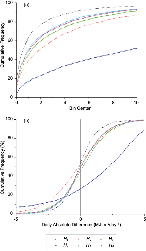 In Figure 4, the cumulative frequency of the coupled method (H5) and the averaged coupled method (H6) have about the same range of daily difference values (91%) as can be monitored from panel (a). This value is slightly lower than the one obtained with the Angstrom method (H1), which gives a very good performance. The daily absolute difference