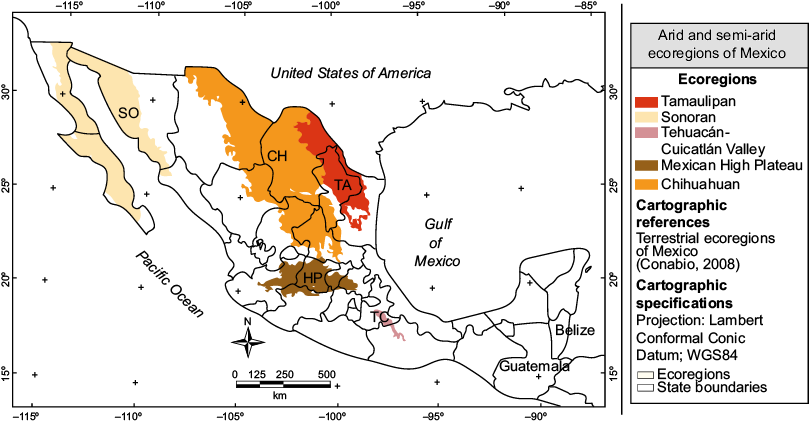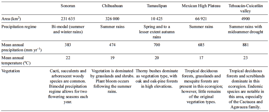 The arid and semi-arid ecoregions were defined according to the regionalization proposed by the Comisión Nacional para el Conocimiento y Uso de la Biodiversidad (National Commission for Biodiversity Knowledge and Management, CONABIO), which is in turn based on the classification used by the Commission for Environmental Cooperation (CEC). As a spatial unit, ecoregions are a useful departure point to inform management policies, as they are both environmentally and ecologically distinct (Olson and Dinerstein, 2002). The polygons defining these ecoregions were obtained in shapefile format from CONABIO (2008) and are presented in Figure 1. Each ecoregion is characterized by differences in temperature and precipitation, and distinct vegetation types. Table Ipresents a summary of these differences.