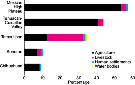 Climatic stressors degrade the condition and viability of an ecosystem through excessive or insufficient regimes of temperature, moisture, solar radiation or a combination of these (EPA, 2008). Warmer temperatures and more variable rainfall regimes linked to climate change threaten the balance of ecological processes in arid and semi-arid ecosystems. In turn, human exploitation results in rapid land use change, while indiscriminate use of resources accelerates the degradation rate. Mexican arid and semi-arid regions face both intense human exploitation and are subject to climate stress; this combination could, in a short period of time, impact productive systems, and eliminate many micro-habitats and endemic species. In this study we found that the degree of degradation and land use differs for each ecoregion, and all of them (except for Tehuacán-Cuicatlán valley) have a high overall exposure to ECE. For each ecoregion we are going to highlight the dominant stressor (LULCC or ECE) and discuss how observed climatic trends could enhance these effects.