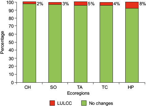 From 2002 to 2011, arid and semi-arid ecoregions lost 22 930 km2 of their natural vegetation to agriculture, livestock production and the development of human settlements. The HP was the ecoregion with the highest percentage of LULCC, followed by TA, TC, SO and finally CH (Fig. 3). The spatial distribution of land uses in 2011 and changes in vegetation cover from 2002 to 2011 differs between ecoregions (Fig. 4):