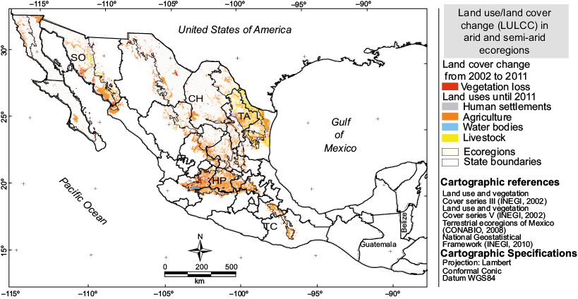 LULCC processes have different origins in the five arid and semi-arid ecoregions in Mexico. Each ecoregion is facing a series of degradation processes that can be traced to pre-Hispanic times, like the HP; others have only recently begun to be intensively exploited, like the TA ecoregion. Although LULCC may seem small when shown in the context of the whole territory (Fig. 3), we must consider several aspects: (a) the assessed period was from 2002 to 2011 (only nine years of change), and (b) the scale of analysis was 1:250 000. Other scales like 1:50 000 would be more appropriate to identify more detailed changes driven by LULCC and ECE. A historical evaluation of the rate of LULCC would be valuable but the methodologies used to generate land use maps in previous editions of the Series are not comparable.