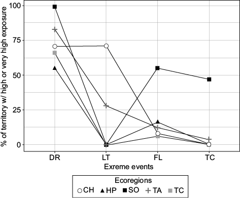 In terms of overall exposure to extreme climate events, most of the territory in all of the ecoregions falls under the high exposure category, which means that they show medium to very high exposure to two of the events. All of the ecoregions, except for the TC, present high to extreme levels of overall exposure in over 65% of their territory, with the HP ecoregion presenting the largest proportion exposed (75%), followed by the TA (71%), the CH (67%) and finally the SO (66%). The SO ecoregion presents the highest proportion of territory under the extreme exposure category (23%), while the TA has the same proportion of territory under very high exposure. These two ecoregions have the highest proportion of territory under the very high to extreme scores (32 and 27%, respectively). In the case of the TC ecoregion, high exposure to extreme events occurs in 38% of its territory, concentrated towards the northern portion (Fig. 6).