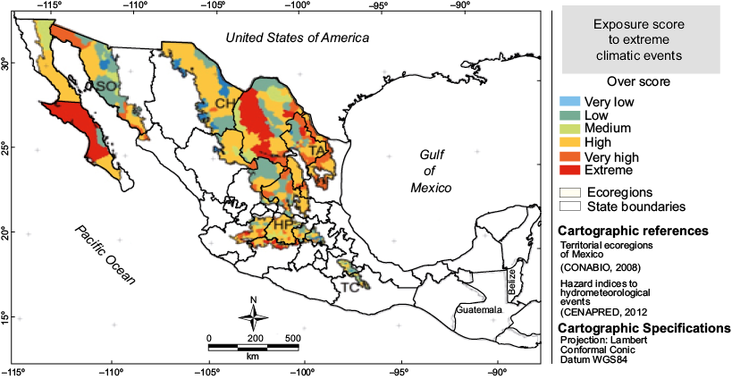 To characterize exposure to ECE in the ecoregions of interest we used hazard indices to flood, drought, tropical cyclones and low temperatures generated by CENAPRED (2012, 2016). These indices measure the exposure to different ECE, expressed in terms of their frequency and intensity during a defined period. The latter information is aggregated at the municipal level, to generate an overall score for the municipality. Score categories range from “very low” (ECE have historically occurred at a low frequency and intensity) to “very high” (ECE have historically occurred at a high frequency and intensity), with intermediate categories (low, medium, high) representing combinations of increasing intensity and frequency. Briefly, the index for tropical cyclones estimates the exposure to these events in terms of both their frequency and intensity (according to the Saffir-Simpson scale) for the period 1949-2010. Exposure to low temperatures is given in terms of extreme minimum temperatures, number of days with freezes, and number of climate disaster declarations due to freezing temperatures, accounting for events from 1970 to 2010. The drought index expresses the duration of periods with precipitation deficits (ranging from 0-40% precipitation deficit and durations in the range of an average between 1-4 yrs) relative to mean annual precipitation (calculated for the period 1940-2000). Finally, exposure to flooding is expressed in terms of the proportion of the territory of the municipality that falls in flood-prone areas. For a more detailed account of how each index was constructed, refer to the original source (CENAPRED, 2012, 2016).