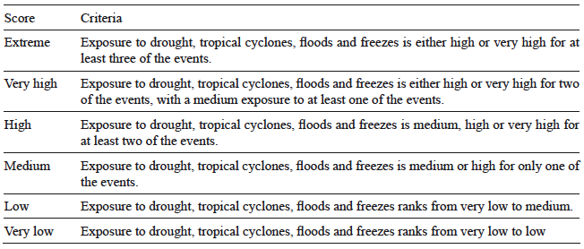 We present a map of the overall current exposure to ECE for municipalities that belong to the studied ecoregions. Thus, the spatial unit of analysis for our study is the municipality. To produce this result, we assigned a score to each of the municipalities within the ecoregions of interest, based on their exposure to each separate ECE according to CENAPRED indices. Depending on their exposure category and the number of events with a given exposure category, we generated five possible overall exposure scores: extreme, very high, high, medium, low and very low, and assigned a score to each municipality. Criteria for each score are summarized in Table II.