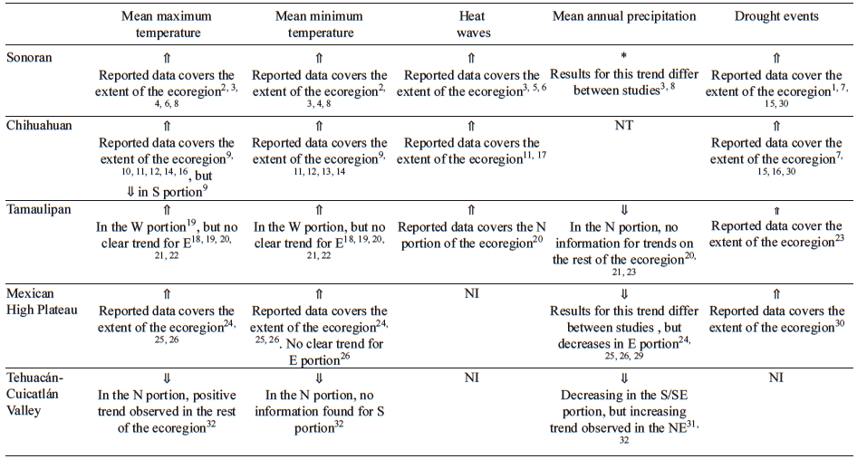 Changes in frequency, duration or intensity in events or climatic variables that alter the precipitation regime or temperature will affect water availability in arid and semi-arid ecoregions. Documenting the current trends in these events and variables is essential to determine climate stressors in these environments. To this purpose, we reviewed the current knowledge on temperature, precipitation, tropical cyclones, heat waves, freeze, and droughts trends for each of the ecoregions of interest. We searched the Web of Knowledge, SciELO, official reports and dissertation documents archived in the Universidad Nacional Autónoma de México (National Autonomous University of Mexico, UNAM) repository using the following keywords: climate AND variability AND trends, as well as precipitation, temperature, extreme climatic/climate events, droughts, freezes, heat waves and tropical cyclones. The search was conducted both in Spanish and in English. We combined the aforementioned keywords with the following, to narrow down the location to our regions of interest: semidesert AND desert AND arid AND semi-arid AND Mexican, as well as the following keywords for location: Sonoran, Chihuahuan, Tamaulipan, Mexican High Plateau and Tehuacán-Cuicatlán valley, and their equivalents in Spanish. We also used filters on our searches to limit results to the country of interest (Mexico and the USA, given the trans boundary extent of the arid northern ecoregions). We focused on studies that analyzed trends in the recent past (500-30 yrs), and excluded those that dealt with projected trends.