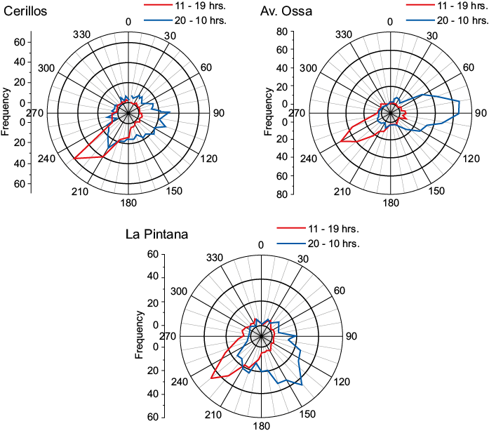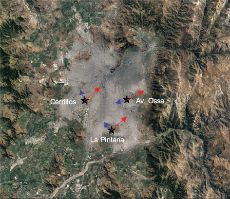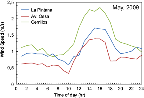 The wind pattern in Santiago de Chile has a valley-mountain behavior with generally low speeds. The predominant wind in the city occurs during the afternoon (11-19 LT) with a south-east direction, as shown in the wind roses of Figure 2. It can be seen that during the afternoon, the wind direction is the same for all stations and has little dispersion. During these hours, the speed is also higher than during the night or early morning. There is also a very clear difference between the day and night wind. Figure 3 shows the wind speed for all sites for the month of May 2009. The wind comes from the coast and enters Santiago from the south-west, therefore the highest speed is achieved in Cerrillos (see Fig. 3), and its velocity decreases as it enters the city. This wind brings clean air from the coast into the city (Gramsch et al., 2006) but it also carries pollutants from downtown Santiago towards the east. As shown in Figure 3, pollutants from La Pintana can be transported into Av. Ossa during the afternoon. At night and early morning, the wind direction reverses; however, the velocity is very low and the direction is not the opposite of the afternoon wind. Thus, there is probably no transport of pollutants from Av. Ossa towards the other sites at night.