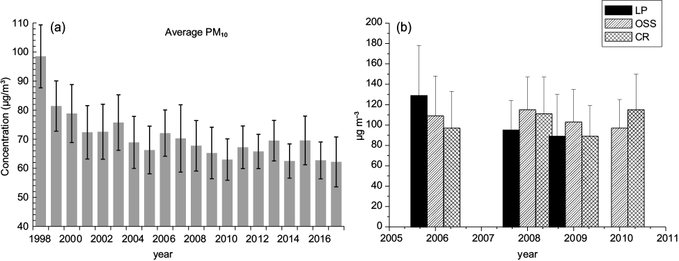 In Santiago, Chile, PM10 concentrations have decreased continuously since 1998, but the trend has slowed down since 2010. Figure 4a shows the PM10 yearly average for the nine stations belonging to the air pollution network of the Sistema de Información Nacional de Calidad del Aire (National Air Quality Information System, SINCA) inside Santiago (SINCA, 2018). This network is used by the authority to monitor several air pollutants as well as meteorological variables. PM10 is measured using TEOM monitors (Rupprecht & Patachnick, Albany, NY, and Thermo Fisher Scientific, Waltham, MA). From 2007 (70.3 µg m–3) to 2010 (63.0 µg m–3) there was a slight decrease in PM10, however this trend did not continue and PM10 has leveled since 2010, as shown in Figure 4a. In the three monitoring stations (Cerrillos [CR], La Pintana [LP] and Av. Ossa [OSS]) there has also been a slight decrease in concentrations from 2006 to 2010, as shown in Figure 4b. During these years important measures have been implemented to abate air pollution from public transport, which included the restructuring of the public transport system, the renewal of the vehicle fleet, and the shortening of circulation routes. These measures were somewhat unpopular, leading to a slight increase of private vehicles (around 6% more in 2009 with respect to 2003 [INE 2011]). This result agrees partly with the report of the Sociedad Chilena de Políticas Públicas (Chilean Society of Public Policies), which notes that “the annual evolution of PM10 between 1997 and 2010 shows a decreasing but moderate trend, indicating that air quality has improved steadily over the past 15 years”. However, as shown in Figure 4a, since 2010 the trend has decreased, and PM10 levels have been fairly constant (Moreno et al., 2010; Figuero et al., 2017).